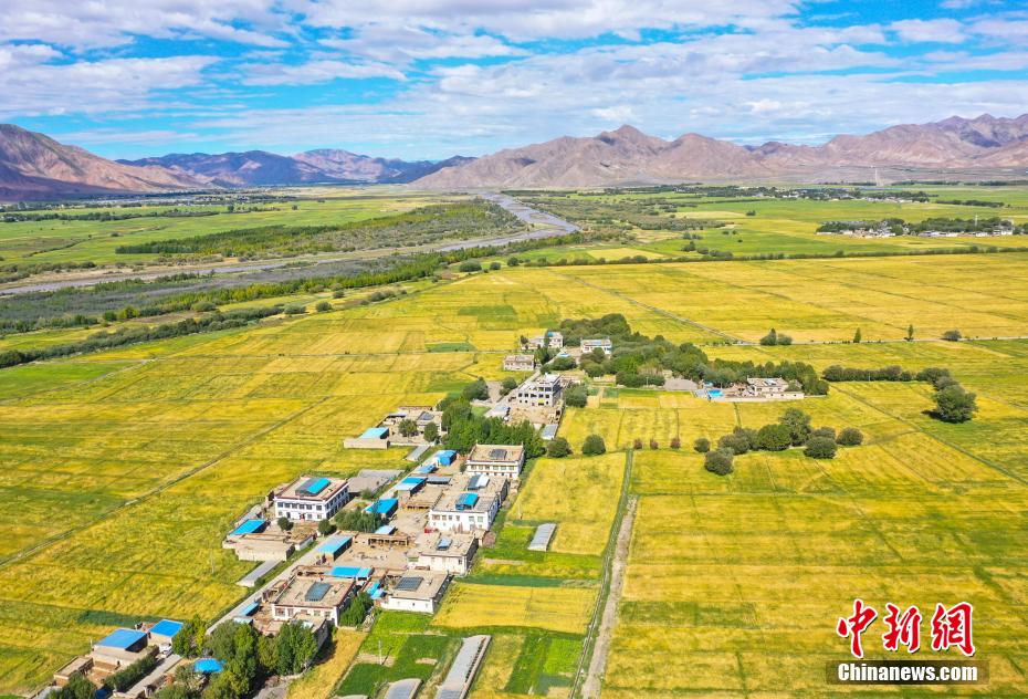 8月25日,西藏日喀則白朗縣仁青崗村,田園、村莊、河流、公路、遠山交相輝映,構(gòu)成一幅美麗的田園風光畫卷。(無人機照片)