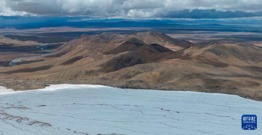 這是9月4日拍攝的普若崗日冰原8號冰川、消融形成的徑流以及遠(yuǎn)處的令戈錯(無人機(jī)拼接照片)。新華社記者 姜帆 攝