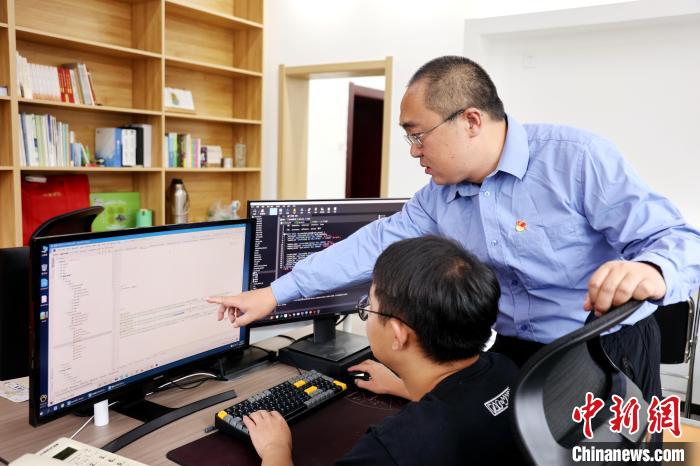 圖為蔡海寧(右)指導(dǎo)同事進行編程。張?zhí)砀?攝