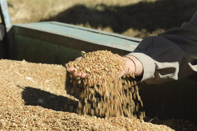 “我家共有92畝多的農(nóng)田,家里有三個勞力,我負(fù)責(zé)秋收,其余兩個外出務(wù)工,以前我們家秋收工作需要一個月多的時間,現(xiàn)在農(nóng)業(yè)機(jī)械化了,再也不用擔(dān)心秋收工作,聽說今年賣良種每斤有0.3元的補(bǔ)貼,準(zhǔn)備把自家10000斤良種賣掉,預(yù)計今年有56000多元的收入?!闭诎徇\(yùn)青稞粒的村民普瓊高興地說道。