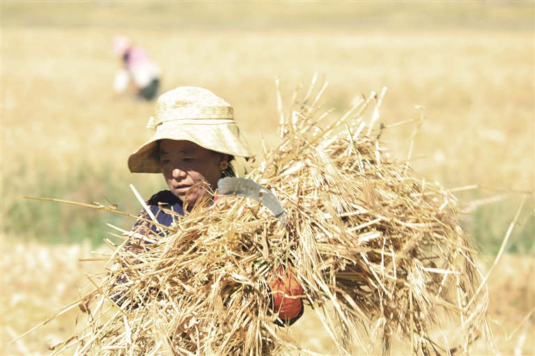 金秋九月,風(fēng)吹麥浪、穗粒飽滿,連日來,在墨竹工卡縣金黃色的農(nóng)田里,處處可見勤勞的農(nóng)民們搶抓時機(jī),開展小油菜和青稞收割、晾曬、搬運(yùn)、儲藏,確保糧食顆粒歸倉。