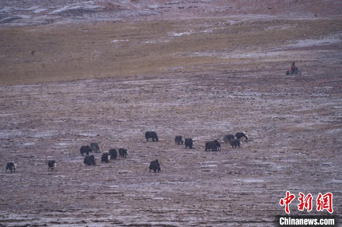 10月23日,西藏自治區(qū)那曲市安多縣多瑪鄉(xiāng)牧民在雪中放牧。當(dāng)日,一場(chǎng)雪將藏北草原裝扮得如詩(shī)如畫。牧民們?cè)谶@銀裝素裹的天地間,開始了雪中放牧的生活。牛羊在雪地中悠閑覓食,牧民駕駛著摩托車,在雪中放牧,形成了一幅動(dòng)人的風(fēng)景畫。圖為牦牛在草原上覓食。中新社記者 貢嘎來松 攝