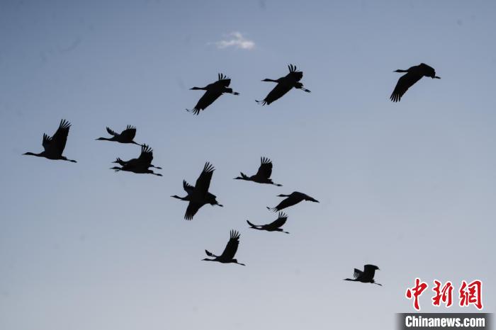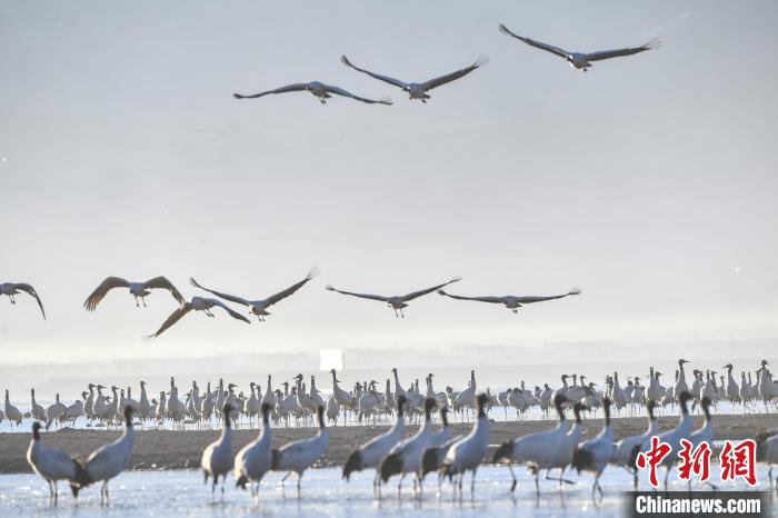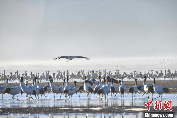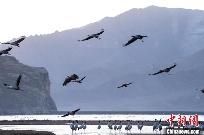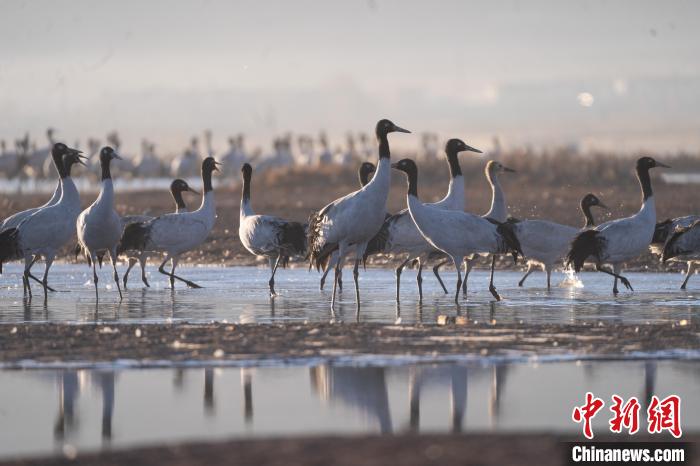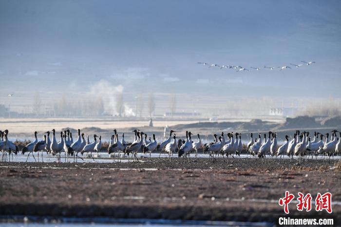 11月27日晨,西藏自治區(qū)拉薩市林周縣黑頸鶴保護(hù)區(qū)內(nèi),大量越冬的黑頸鶴在虎頭山水庫(kù)覓食、嬉戲。林周縣位于拉薩河上游及澎波河流域,平均海拔約4200米,是黑頸鶴的主要越冬地之一。中新社記者 貢嘎來(lái)松 攝