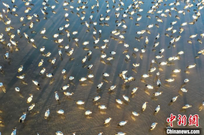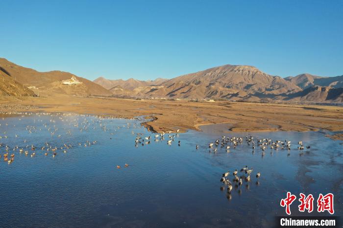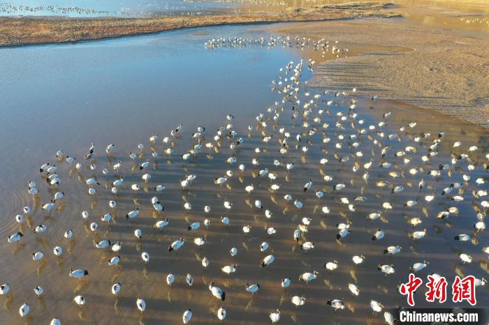 11月27日晨,西藏自治區(qū)拉薩市林周縣黑頸鶴保護(hù)區(qū)內(nèi),大量越冬的黑頸鶴在虎頭山水庫(kù)覓食、嬉戲。林周縣位于拉薩河上游及澎波河流域,平均海拔約4200米,是黑頸鶴的主要越冬地之一。(無(wú)人機(jī)照片)中新社記者 貢嘎來(lái)松 攝