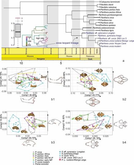 江左其杲指出,結(jié)合DNA序列和形態(tài)學(xué)數(shù)據(jù),研究團(tuán)隊(duì)推斷豹屬的系統(tǒng)發(fā)育,支持5例化石記錄的確屬于現(xiàn)生雪豹支系,且它們相對(duì)現(xiàn)生雪豹組成并系群,表明這些青藏高原之外的雪豹并非獨(dú)立于現(xiàn)生雪豹的一個(gè)分支,而是不斷從雪豹主干上分出的小分支,說(shuō)明它們很有可能代表雪豹多次在特定時(shí)間段走出青藏高原的記錄,而這些記錄共同組成了雪豹演化的幾個(gè)斷面,從而得以揭秘雪豹如何一步步特化。