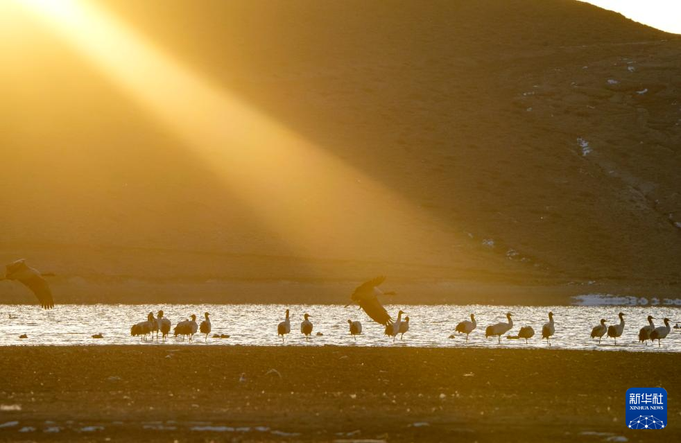 2月20日清晨,第一縷陽光照耀在西藏拉薩市林周縣越冬的黑頸鶴身上。新華社記者 晉美多吉 攝