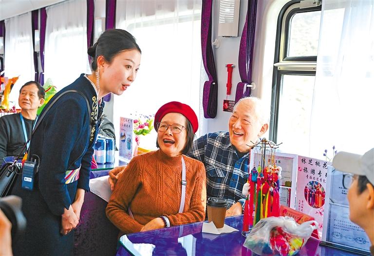 3月26日,入藏旅游專(zhuān)列列車(chē)員在為旅客介紹非遺產(chǎn)品。新華社記者 齊芷玥 攝