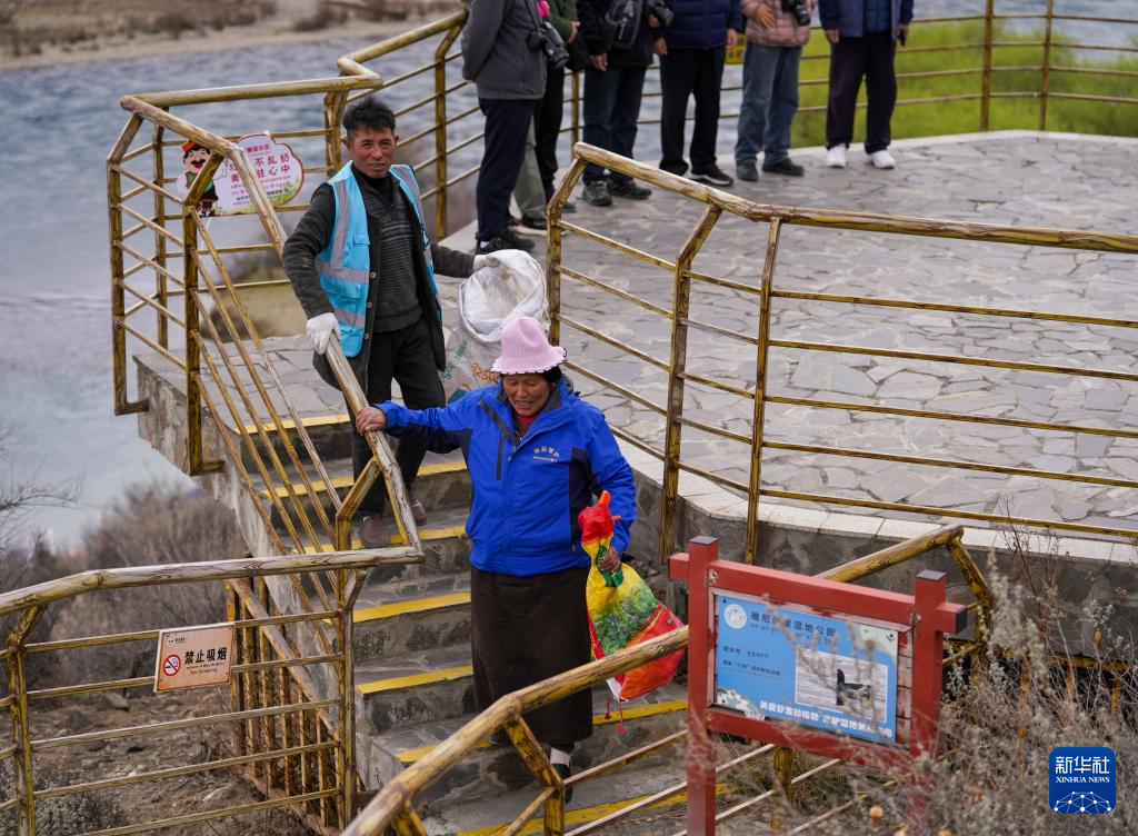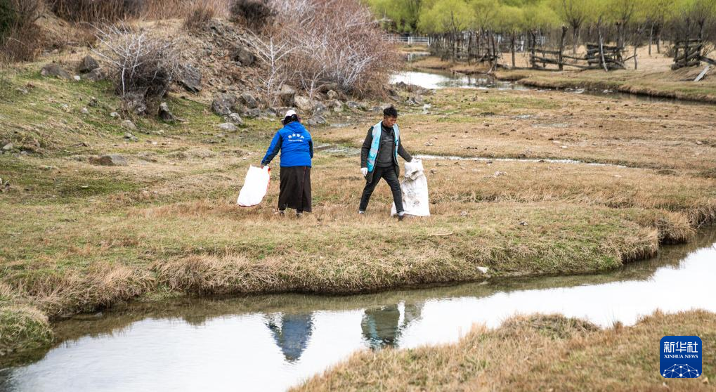 4月4日,雅尼國家濕地公園管護員在巡護途中清理垃圾。新華社記者 丁增尼達 攝