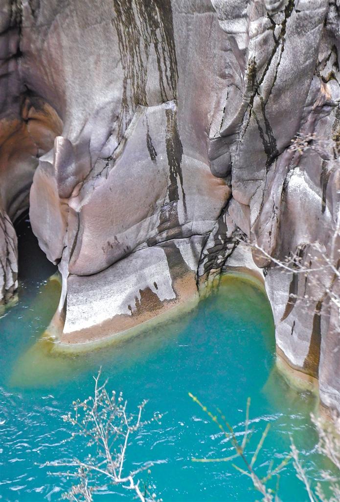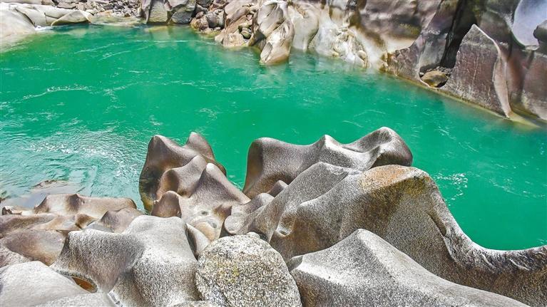 察隅縣千年水磨巖適合觀賞期在春、秋、冬三季的枯水期。此時水位下降、巖石露出,水色澄碧、怪石嶙峋,石頭似臥犀、似河馬、似龍爪、似漏斗、似波浪,形態(tài)多變,與森林、水流、高山懸崖相呼應,組合成難得一見的山水畫卷。
