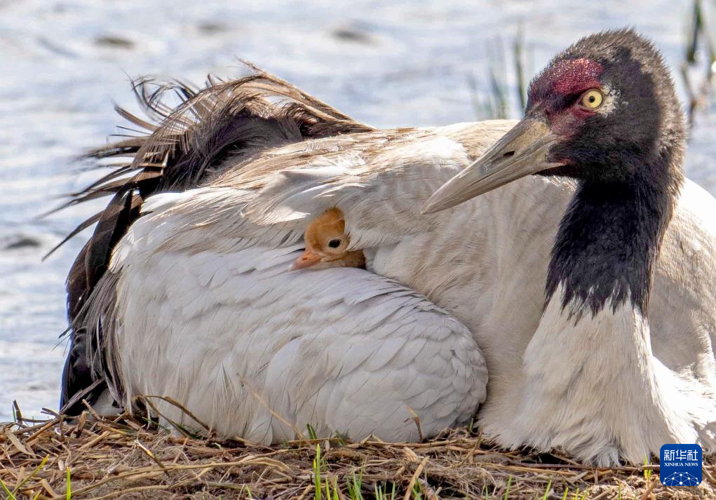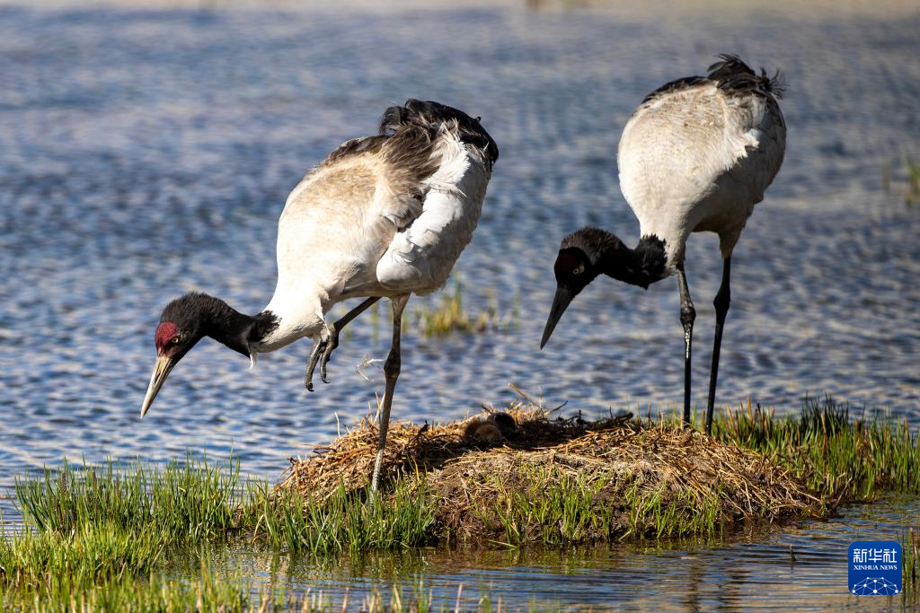 一對黑頸鶴在那曲市申扎縣的濕地上照顧剛出殼的雛鳥,一只將其護在身下保持溫暖,另一只則在旁保持警戒(6月4日攝)。新華社記者 姜帆 攝