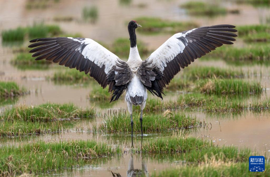6月4日拍攝的在那曲市申扎縣周邊濕地里棲息的黑頸鶴。新華社記者 旦增尼瑪曲珠 攝