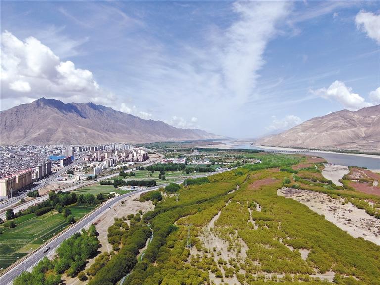 雅江中游“百里綠色生態(tài)長(zhǎng)廊”與日新月異的山南市區(qū)和諧共生,展現(xiàn)出高原獨(dú)有的生態(tài)之美(無(wú)人機(jī)照片)。記者 武沛濤 攝