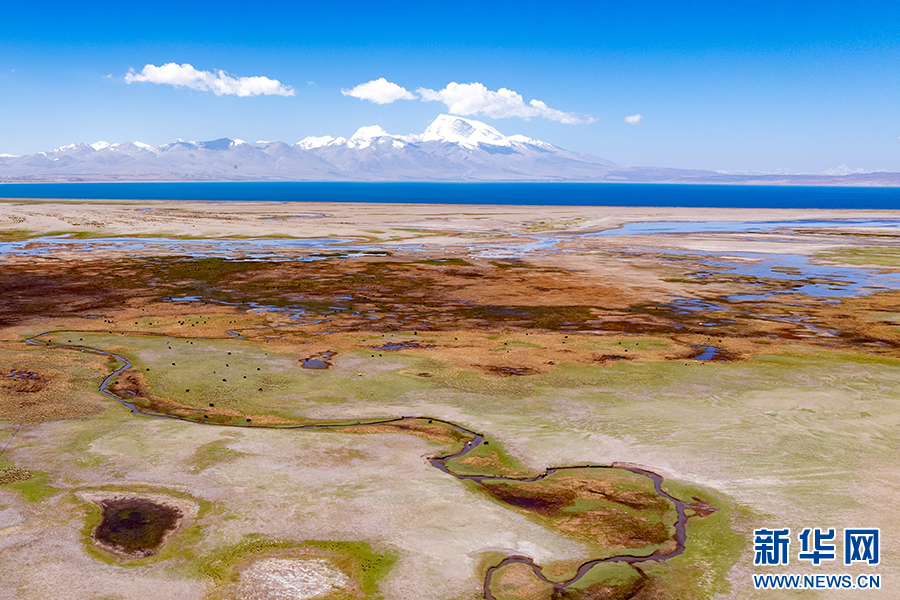 遠(yuǎn)處的瑪旁雍錯(cuò)與綠意漸濃的濕地(6月9日攝,無人機(jī)照片)。新華網(wǎng) 旦增努布 攝