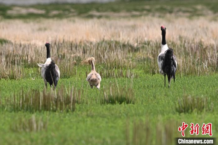 7月10日,在海拔4700米的西藏自治區(qū)那曲市申扎縣濕地里,黑頸鶴一家在悠閑覓食。黑頸鶴是中國國家一級(jí)重點(diǎn)保護(hù)野生動(dòng)物,屬高原特有鶴類,主要棲息于海拔2500米至5000米的高原沼澤地、湖泊及河灘等濕地環(huán)境。每年四月起,成對(duì)的黑頸鶴陸續(xù)飛抵西藏自治區(qū)那曲市申扎縣,在此繁育后代。近年來,申扎縣持續(xù)加強(qiáng)生態(tài)修復(fù),濕地面積擴(kuò)大、水質(zhì)改善,為黑頸鶴等珍稀物種提供了理想家園。中新社發(fā) 毛建軍 攝