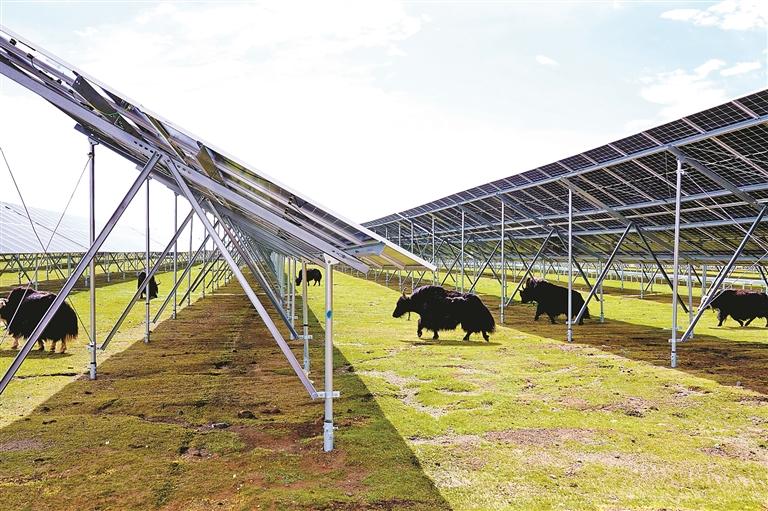 在華電羅布沙光伏項目區(qū),整齊的光伏板陣列與圣潔的雪山共同構成獨特景致。光伏板下,回鋪的草甸悄然復蘇,牦牛悠然其間覓食,形成獨特的“牧光互補”模式,實現了生態(tài)保護與清潔能源生產的雙贏。