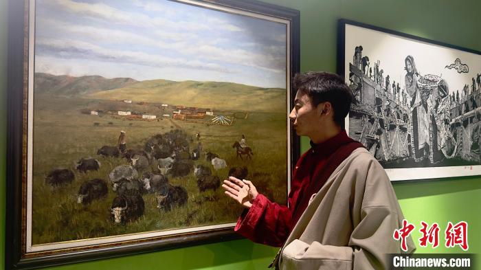 大賽美術組二等獎獲得者、西藏大學藝術學院美術系研一學生郭扎正在向觀眾展示自己的美術作品。澤塔雍措 攝