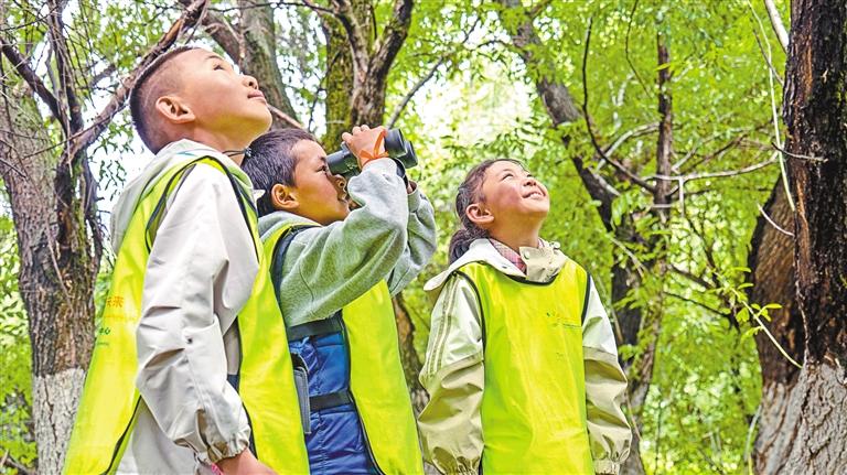 孩子們在拉魯濕地用望遠(yuǎn)鏡觀察鳥類。記者 鹿麗娟 攝