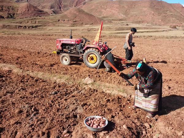 在充分調(diào)研的基礎上,嘎瑪澤加從本村實際出發(fā),積極爭取項目、資金支持,于2014年起牽頭在全村推廣紅土豆和藍青稞特色產(chǎn)業(yè)種植工作。經(jīng)過不斷努力,成功將覺恩村紅土豆種植面積擴大到1200畝、藍青稞1000畝,這兩項種植業(yè)每年為群眾創(chuàng)收430萬元,使群眾看到了發(fā)展特色種植產(chǎn)業(yè)帶來的實實在在的經(jīng)濟效益。