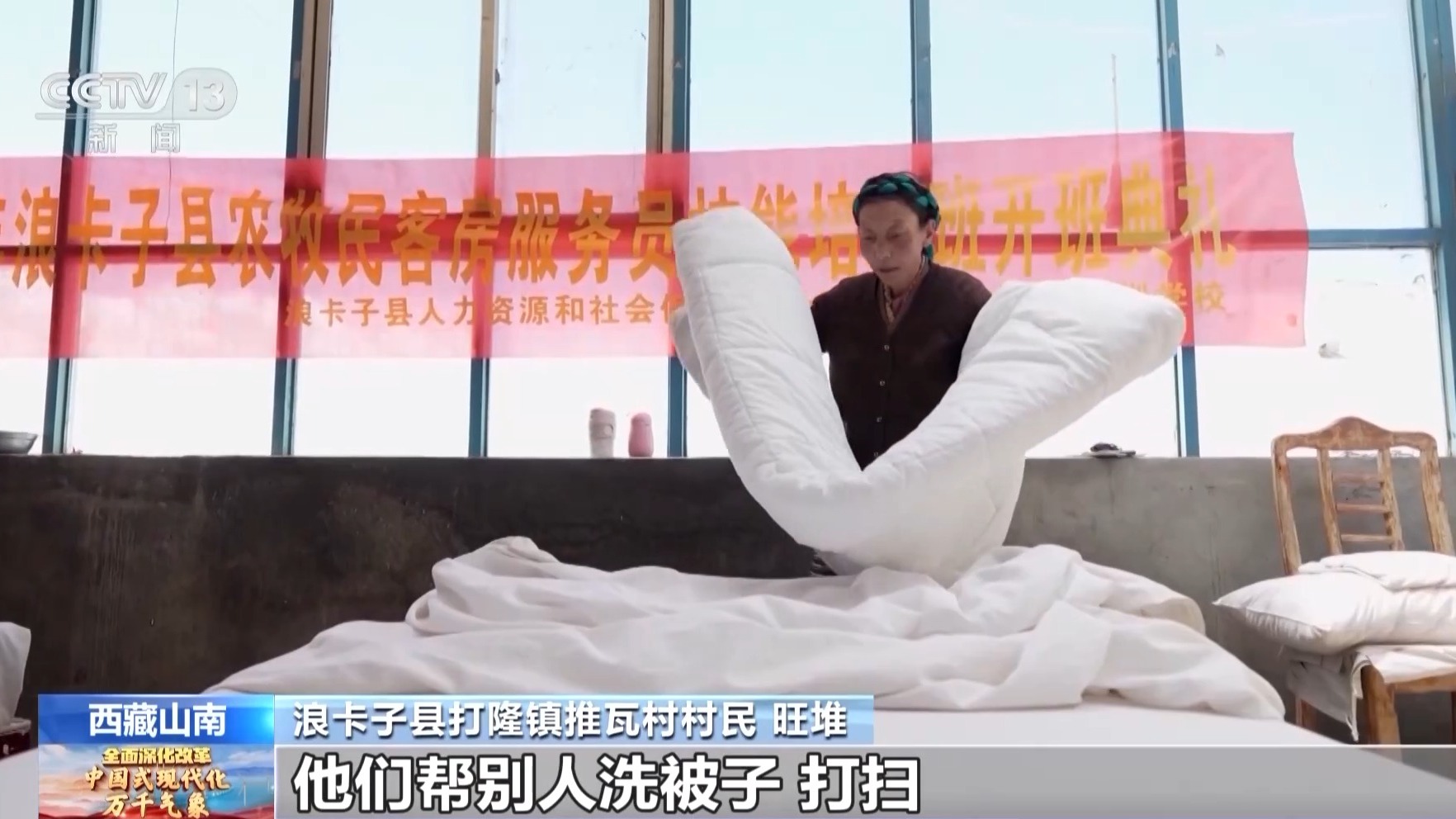 旺堆:村民有這樣的觀念,他們幫別人洗被子、打掃,他們都不愿意,他們試了以后,他們一年里面得到了25000元的收入,慢慢他們把傳統(tǒng)的觀念放下了。