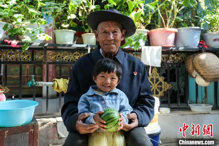 現(xiàn)年77歲的邊巴頓珠是彭倉村種大棚“第一人”。圖為8月23日,邊巴頓珠和孫女抱著一個(gè)自家種出來的大棚西瓜。記者 江飛波 攝