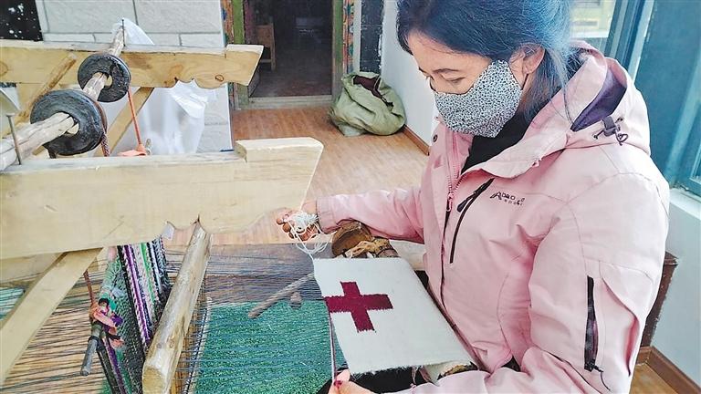 在這里,一場(chǎng)編織技能培訓(xùn)正在進(jìn)行,婦女們的雙手在織線之間來回游走穿梭,正專注地編織著藏式包、卡墊等各種手工藝品。