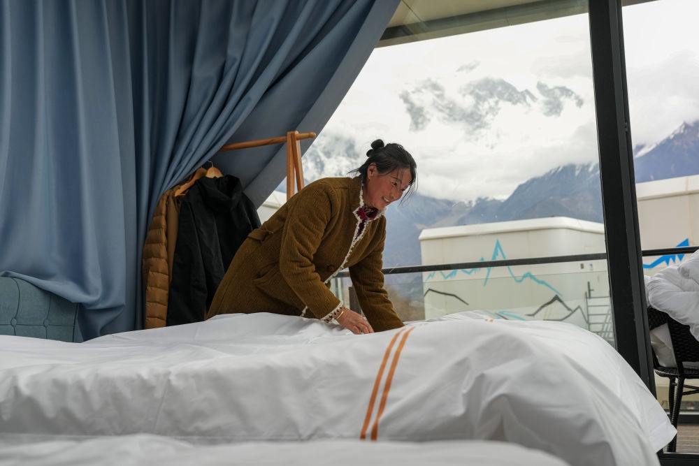 2025年4月4日,林芝索松村一家民宿的服務(wù)員在整理房間。近年來,林芝在生態(tài)保護與旅游發(fā)展的良性互動中,探索出“賞花+民宿”“賞花+文創(chuàng)”等復(fù)合經(jīng)營模式。2025年4月4日至4月6日期間,林芝市累計接待游客20.86萬人次,同比增長20.58%;實現(xiàn)旅游收入1.5億元,同比增長37.62%。