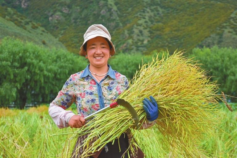 圖為嘎拉村村民在收割油菜。記者 劉楓 攝