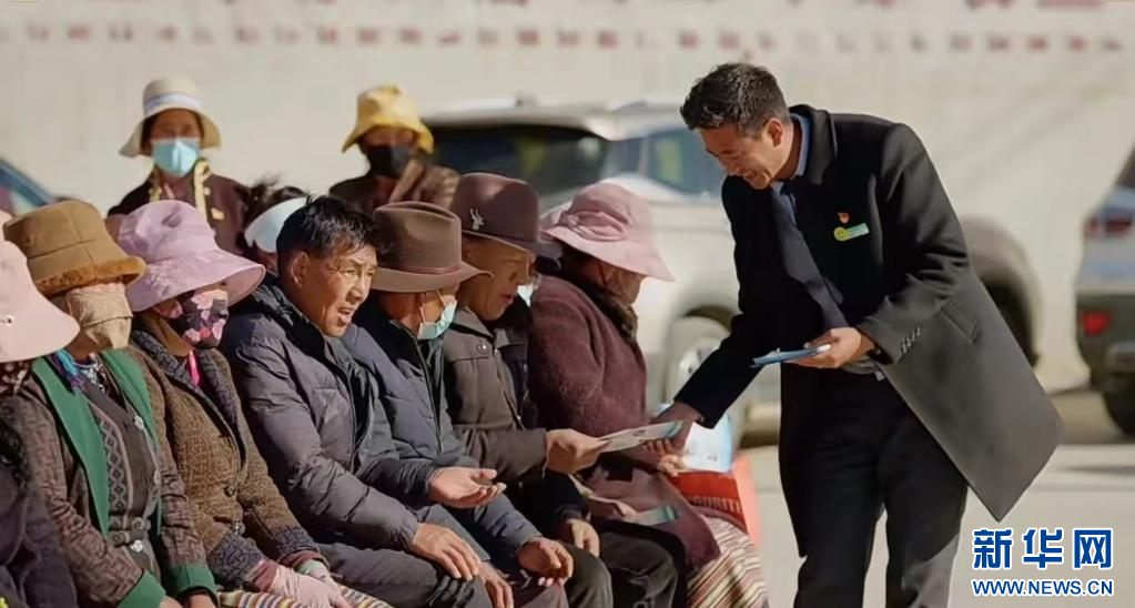 工作人員阿旺旦增為扎洞村群眾宣講金融知識,并介紹“庭院經(jīng)濟貸”相關(guān)業(yè)務(wù)。(中國農(nóng)業(yè)銀行股份有限公司山南分行供圖)
