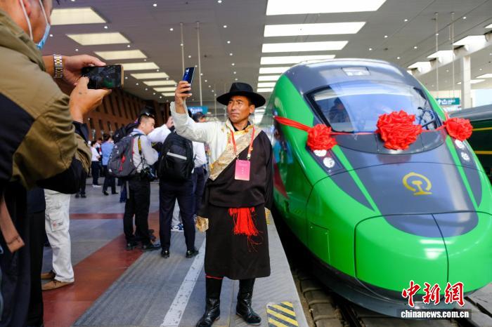 資料圖為2021年6月25日,西藏拉林鐵路開通運營,民眾在拉薩火車站與復興號拍照留念。當日,斯朗旺扎系首發(fā)司機。中新網記者 江飛波 攝