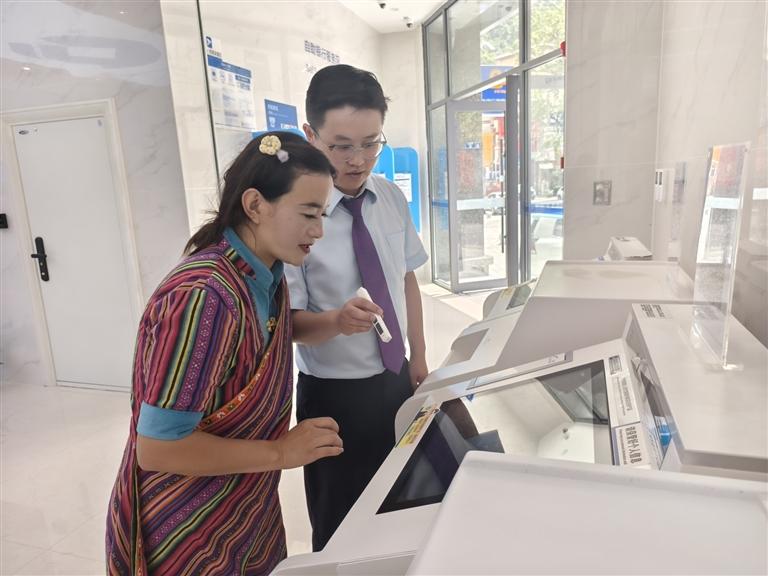 中國建設(shè)銀行墨脫支行開業(yè)當(dāng)天,工作人員成功為當(dāng)?shù)亻T巴族客戶在智慧柜員機(jī)上辦理首筆業(yè)務(wù)。