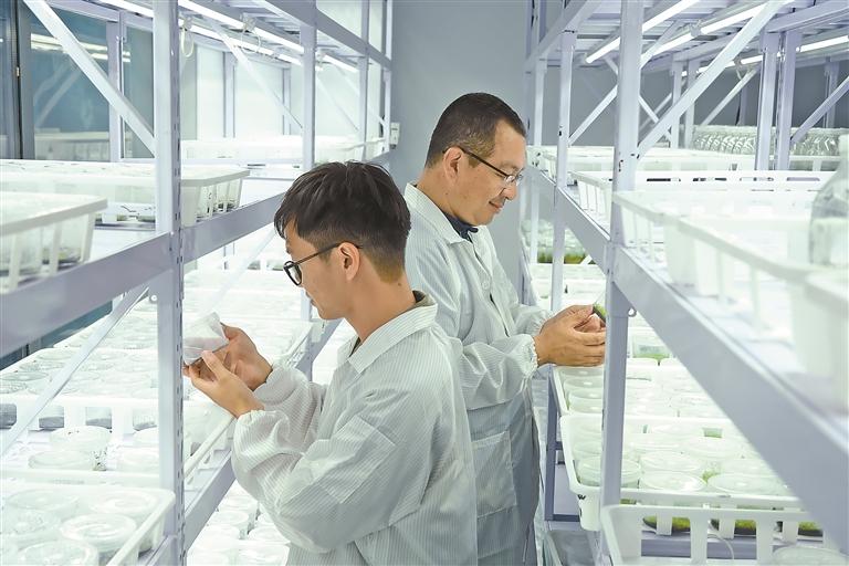 圖為基地工作人員正在檢查組織培養(yǎng)瓶里植物的長(zhǎng)勢(shì)。圖/文 記者 謝筱純 王珊