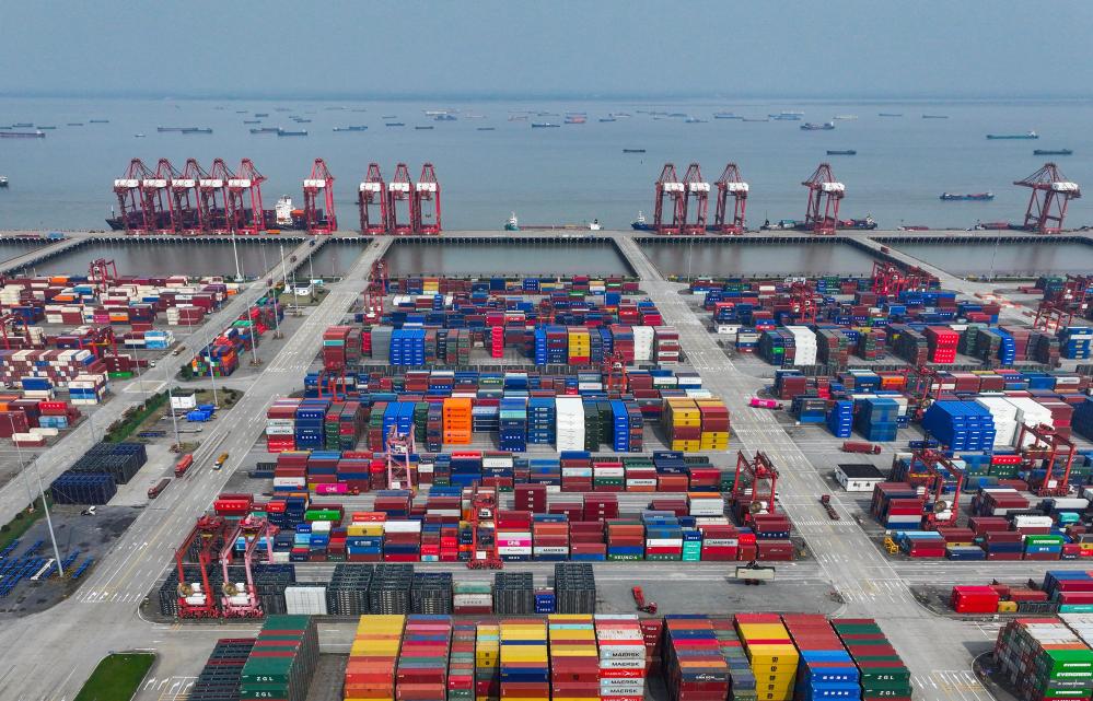 江蘇省蘇州港太倉港區(qū)集裝箱碼頭,集裝箱吞吐作業(yè)繁忙(無人機(jī)照片,10月10日攝)。新華社記者 李博 攝