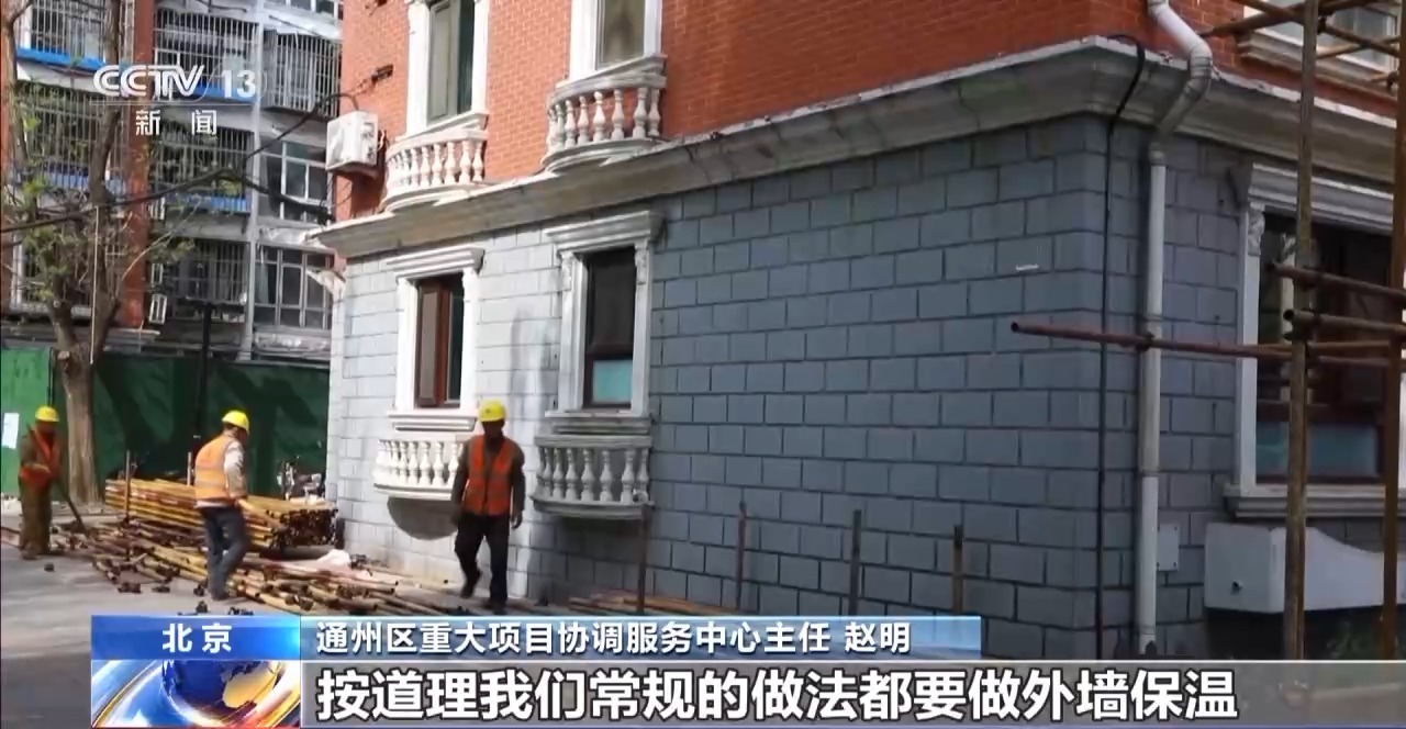北京市通州區(qū)重大項目協調服務中心主任 趙明:前面那棟樓外墻在改造,按道理,我們常規(guī)的做法都要做外墻保溫。這兩棟樓,老百姓認為我的外墻瓷磚有保溫,我就不需要再做這事了。