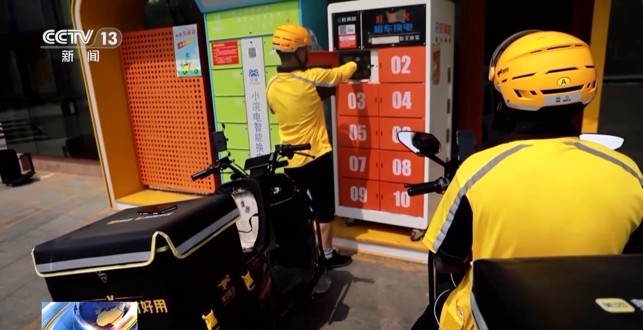 外賣員 崔鳳洋:給我們提供了很方便的換電站,我們?nèi)绻叻迤跊]有電了,可以來這里換電,如果中午非常熱,感到身體有點(diǎn)難受可以到這來,也提供解暑藥品。