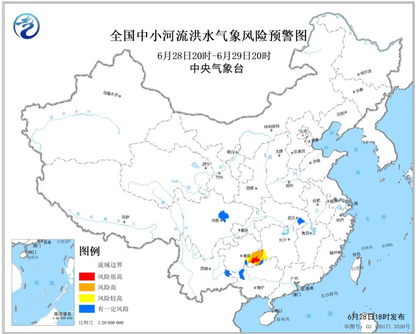 預(yù)計(jì),6月28日20時(shí)至29日20時(shí),貴州東南部等地部分地區(qū)發(fā)生中小河流洪水的氣象風(fēng)險(xiǎn)高(橙色預(yù)警),其中,貴州東南部局地發(fā)生中小河流洪水的氣象風(fēng)險(xiǎn)很高(紅色預(yù)警)。請(qǐng)各地密切注意降水引發(fā)的中小河流洪水,并做好實(shí)時(shí)監(jiān)測(cè)、防汛預(yù)警和轉(zhuǎn)移避險(xiǎn)等防范工作。