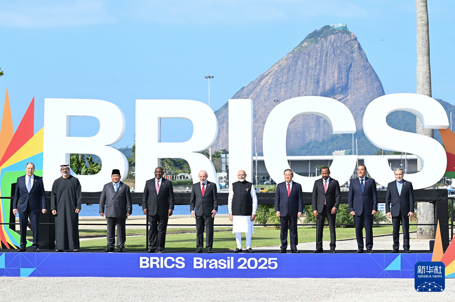 當?shù)貢r間7月6日,國務院總理李強在里約熱內(nèi)盧出席金磚國家領導人第十七次會晤第一階段會議,就“和平與安全、全球治理改革”議題發(fā)表講話。這是與會領導人集體合影。新華社記者 李響 攝