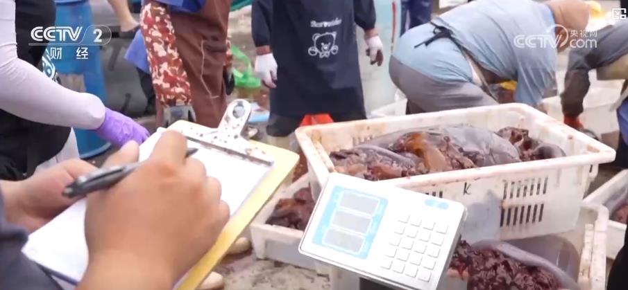 在南漁港碼頭,漁船剛一???,漁民們便爭分奪秒地卸貨、稱重。今年,在煙臺(tái)龍口海蜇專項(xiàng)捕撈期,共有41艘漁船成功辦理了海蜇專項(xiàng)捕撈許可證,得以出海作業(yè)。