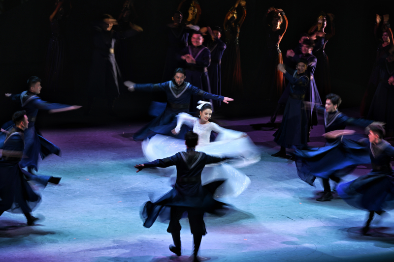 新疆木卡姆藝術(shù)集歌、舞、樂于一體。這部舞劇高潮時(shí)刻,盛大的婚禮歌頌著愛情,彈撥爾、熱瓦普等樂器依次奏響,刀郎木卡姆、哈密木卡姆等輪番上演。演員舞姿或剛勁有力,或熱鬧歡愉,帶領(lǐng)觀眾進(jìn)入歡樂的海洋。