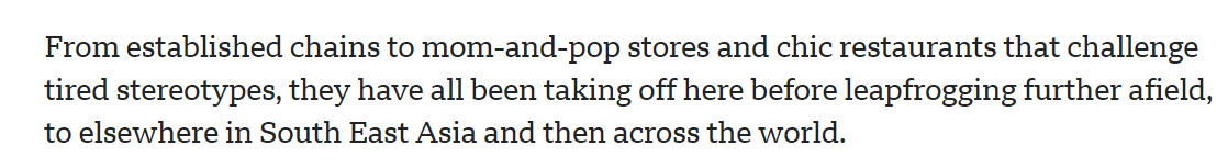 文章說,中國烹飪技藝源遠流長、博大精深,一桌美食盛宴或許正是中國最有效卻又最被低估的吸引力所在。還是以新加坡為例,商場、公交和地鐵站里,搭配著中國成語的中國美食巨幅亮眼廣告不時閃現(xiàn)。從連鎖巨頭到夫妻小店,再到顛覆刻板印象的時尚餐廳,這些中國美食品牌在向東南亞乃至全球擴張前,都已在這個國際旅游城市嶄露頭角。