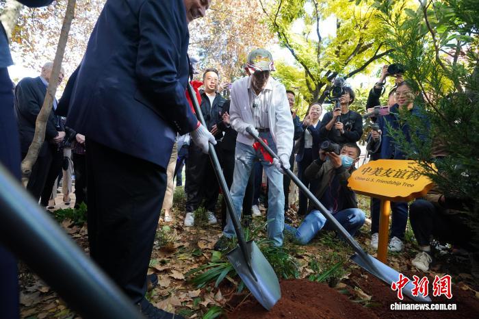 2023年11月3日,美國飛虎隊(duì)老兵哈里·莫耶在昆明與中方代表共植友誼樹。中新社記者 劉冉陽 攝