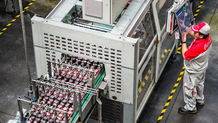 中糧可口可樂(lè)飲料(貴州)有限公司的工作人員在生產(chǎn)線旁進(jìn)行操作(2025年8月24日攝)。