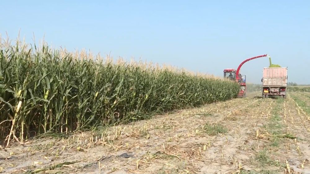 新疆巴音郭楞蒙古自治州焉耆縣的1.5萬畝青貯玉米迎來豐收。在永寧鎮(zhèn)九號渠村,大型青貯收割加工機(jī)將一株株玉米從根部割斷,粉碎后拋入集草車。