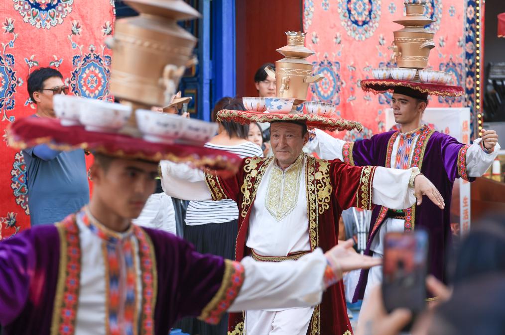 7月22日,在新疆庫(kù)車市的龜茲小巷,表演薩瑪瓦爾舞的演員參與當(dāng)?shù)氐囊粓?chǎng)婚禮活動(dòng)。新華社記者 王菲 攝