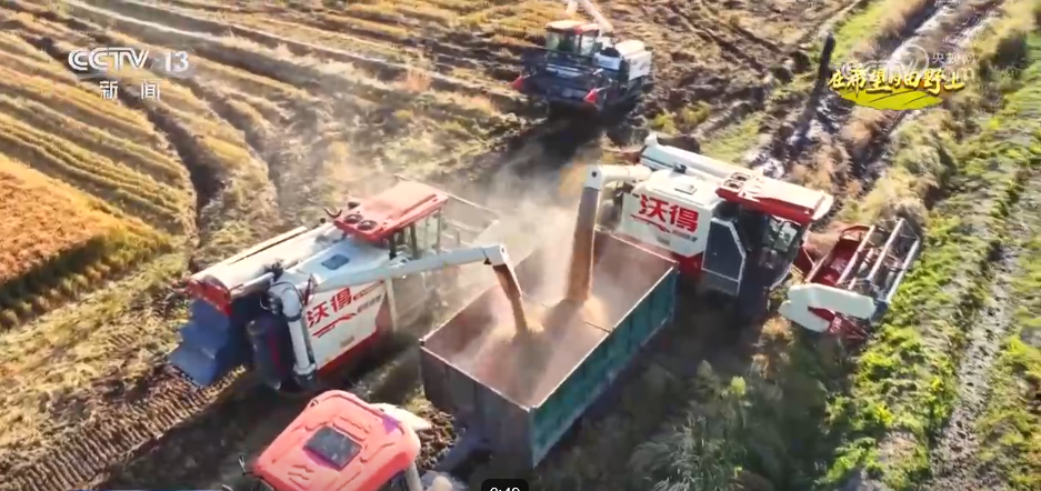 在綏濱縣新富鄉(xiāng)的稻田里,多臺(tái)現(xiàn)代化收割機(jī)正在緊張作業(yè)。伴隨著機(jī)器的轟鳴聲,一排排稻稈被快速卷入收割機(jī),經(jīng)過(guò)脫粒、篩選等工序,飽滿的稻谷源源不斷地從出糧口傾瀉而出,裝入一旁等候的運(yùn)輸車輛中。