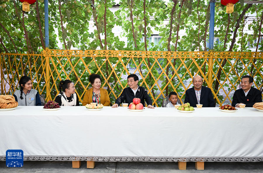 9月25日下午,受習近平總書記囑托,中共中央政治局常委、全國政協(xié)主席、中央代表團團長王滬寧帶領中央代表團部分成員在巴音郭楞蒙古自治州庫爾勒市看望慰問當?shù)馗髯甯刹咳罕姟_@是王滬寧和中央代表團部分成員在庫爾勒市阿瓦提鄉(xiāng)吾夏克鐵熱克村了解鄉(xiāng)村產(chǎn)業(yè)發(fā)展和群眾生產(chǎn)生活情況。新華社記者 張領 攝