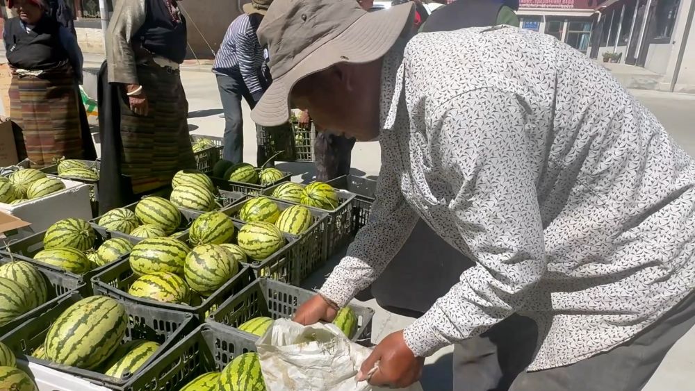 9月,在西藏日喀則市桑珠孜區(qū)年木鄉(xiāng)羅林村,曬場上一派繁忙景象。村民們排起隊(duì)伍,與收購人員并肩協(xié)作,將一個(gè)個(gè)圓滾滾的大西瓜挨個(gè)過秤、裝車,7000斤西瓜被一次性收購。