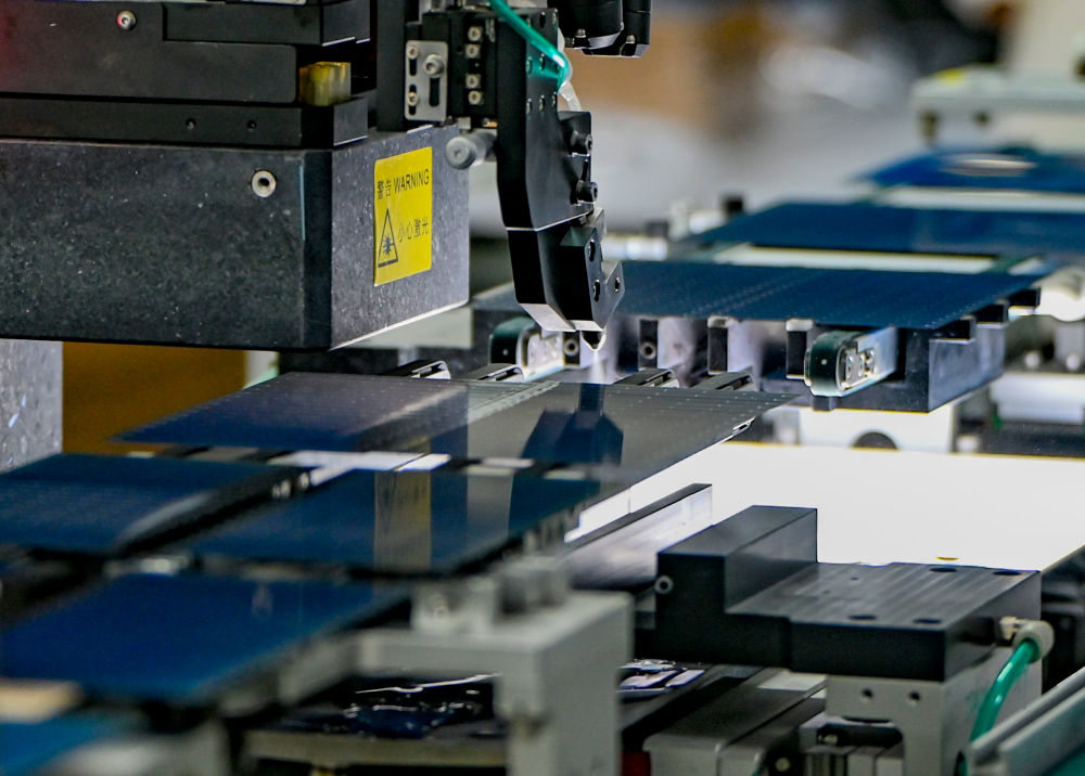 9月22日,工人在新疆巴音郭楞蒙古自治州若羌縣的國晟企誠新能源有限公司對(duì)光伏電池片進(jìn)行疊層返修。