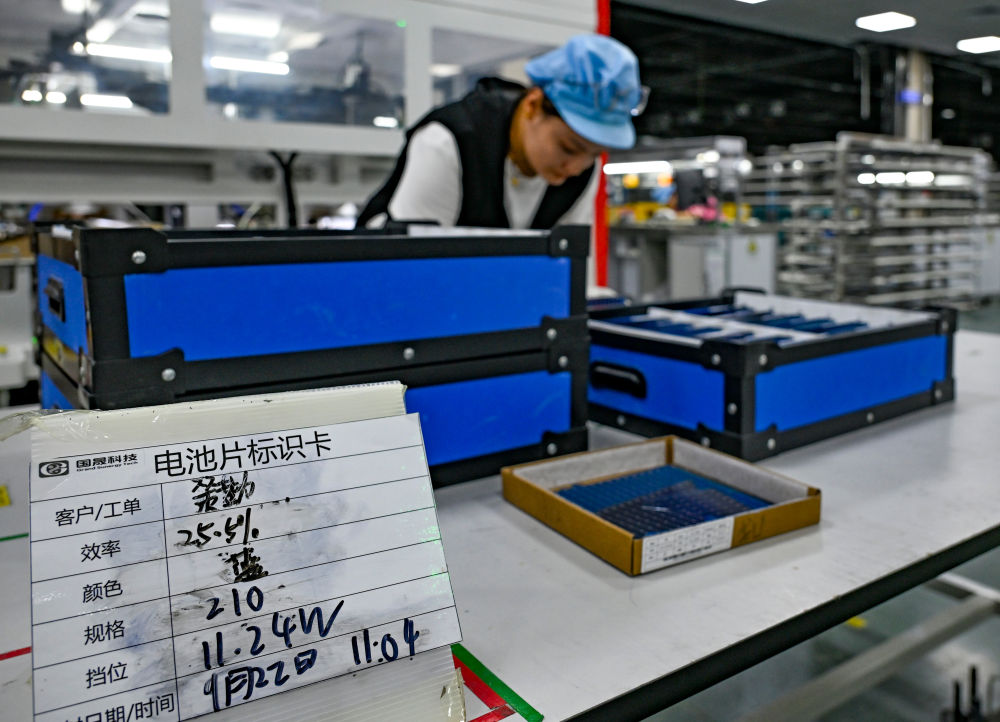 9月22日,工人在新疆巴音郭楞蒙古自治州若羌縣的國晟企誠新能源有限公司對(duì)生產(chǎn)的光伏電池片進(jìn)行質(zhì)檢。