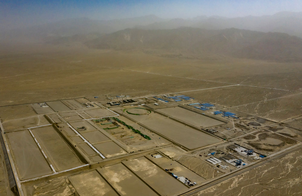 9月22日在新疆巴音郭楞蒙古自治州若羌縣拍攝的三峽集團(tuán)“疆電外送”第四通道電源項(xiàng)目施工現(xiàn)場(chǎng)(無人機(jī)照片)。