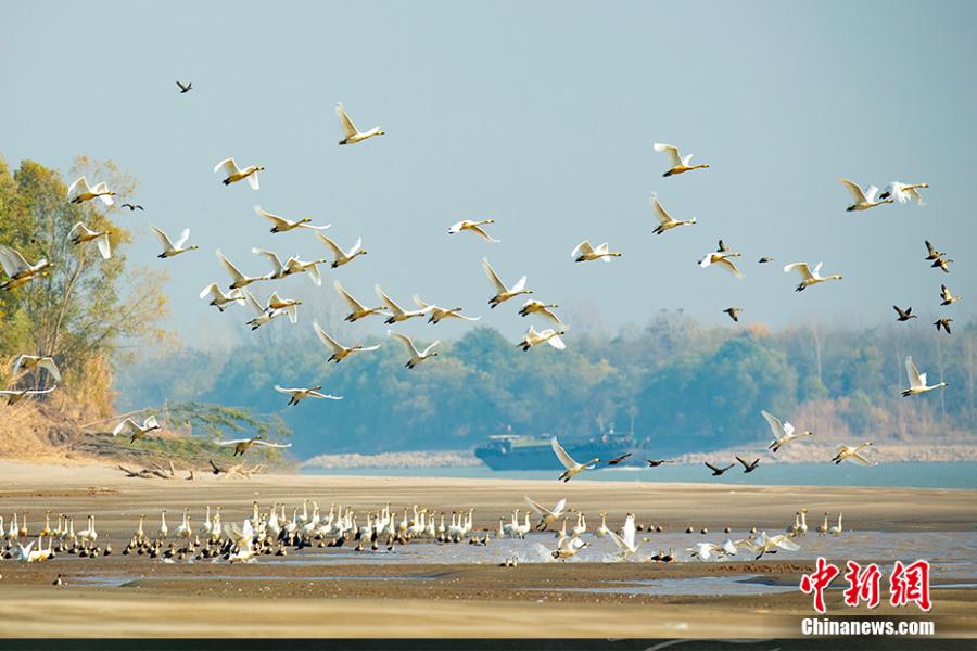 新濟(jì)洲段長江沿岸,小天鵝伴隨貨物船只飛翔。園方供圖